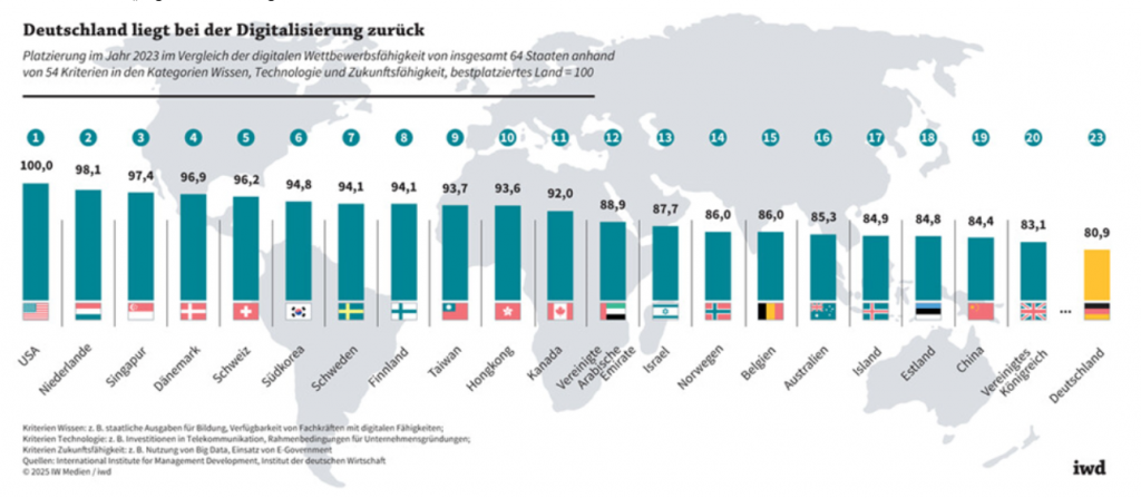 Deutschland steht weiterhin im internationalen Vergleich bei der Digitalisierung vor erheblichen Herausforderungen. Laut Untersuchungen liegt die Digitalisierung von Behörden, Mittelstand und Arbeitsprozessen deutlich zurück, Innovationen werden vor allem durch Fachkräftemangel und fehlende Digitalkompetenzen gebremst.